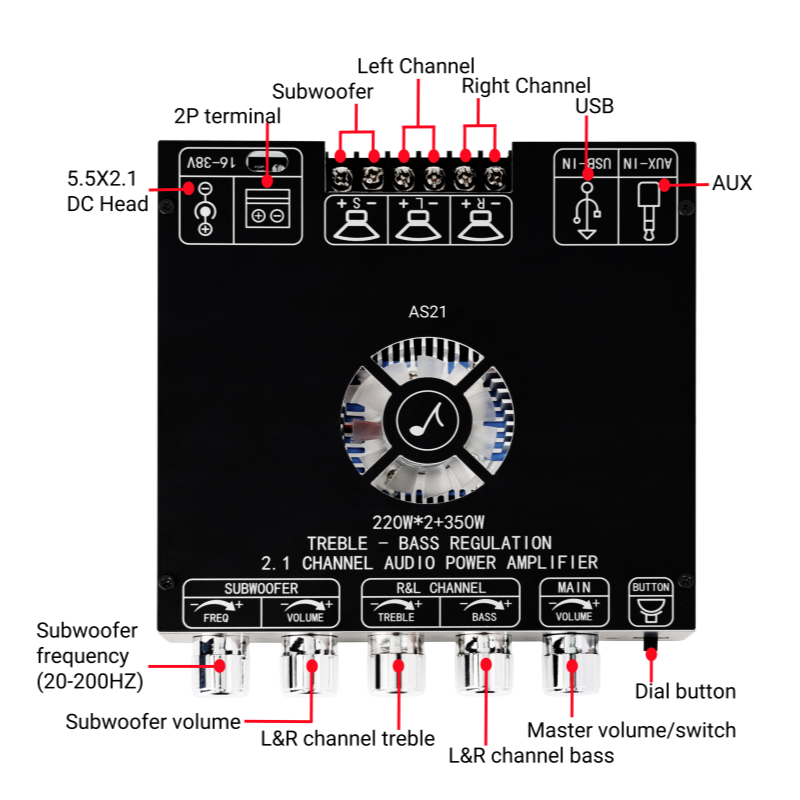 Output Power: 2 x 220W (Left and Right Channels) + 350W (Subwoofer)